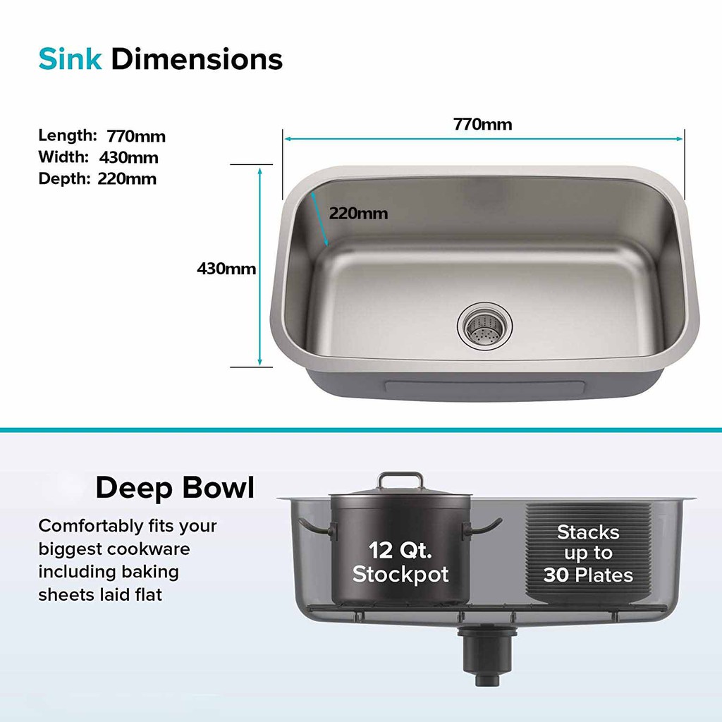 Kitchen Undermount Sink Single Bowl Extra Deep Basin 228mm With